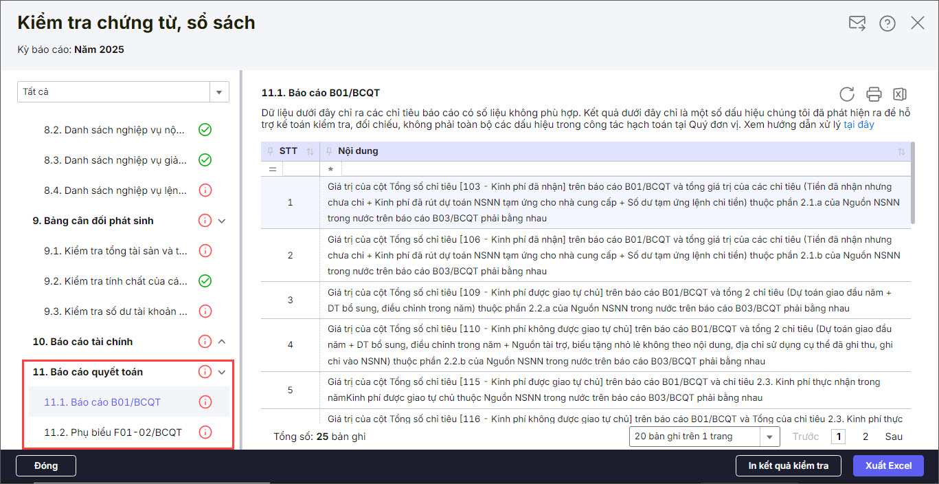 11. Kiểm tra báo cáo quyết toán Bước 1: Vào mục Hướng dẫn quyết toán trên phần mềm. Chi tiết tại đây Bước 2: Xem hướng dẫn cách khắc phục tại đây Lượt xem: 358 Cập nhật 12/12/2025 Bài viết này hữu ích chứ? Có Không Bài viết liên quan 4.2.8. Kiểm tra các kỳ tính hao mòn TSCĐ sai nguyên tắc 4.2.6. Kiểm tra các kỳ trích khấu hao TSCĐ sai nguyên tắc Làm thế nào để phần mềm hiển thị cột Nguồn năm trước trên các màn hình nhập liệu? 8.1. Các bút toán hạch toán tài khoản Giao tự chủ Không giao tự chủ Đầu tư XDCB nhưng chọn nguồn có tính chất khác Giao tự chủ Không giao tự chủ Đầu tư XDCB Tôi in Biểu số 03: Công khai thực hiện dự toán thu-chi ngân sách (TT90/2018/TT-BTC) không hiển thị số liệu cột dự toán năm thì làm thế nào? Tôi in Biểu số 02: Dự toán thu, chi ngân sách nhà nước (TT90/2018/TT-BTC), báo cáo không lên số liệu thì làm thế nào? Giải đáp miễn phí qua facebookNếu bạn vẫn còn thắc mắc hãy đăng câu hỏi vào cộng đồng MISA qua facebook để được giải đáp miễn phí và nhanh chóngĐĂNG BÀI NGAY