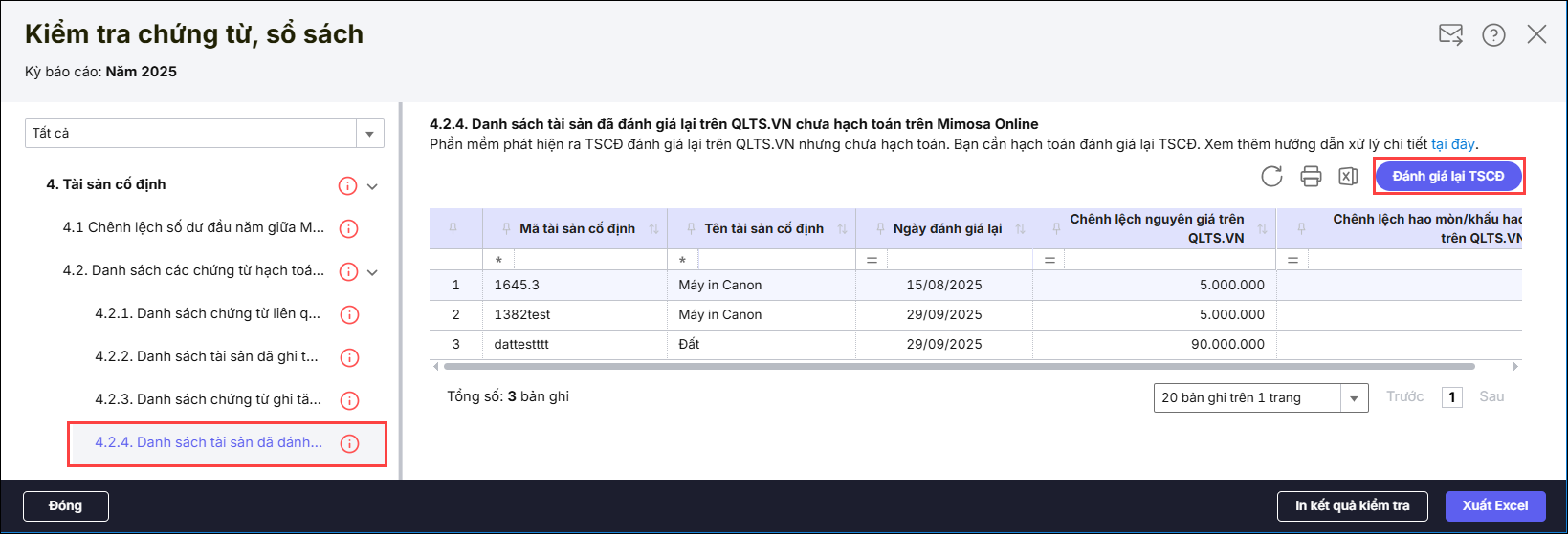 Bài viết này hướng dẫn anh/chị cách kiểm tra và xử lý khi thực hiện kiểm tra chứng từ sổ sách phần mềm cảnh báo các tài sản cố định đã đánh giá lại trên phần mềm QLTS.VN nhưng quên chưa hạch toán trên Mimosa nên không hiển thị trên Sổ cái.