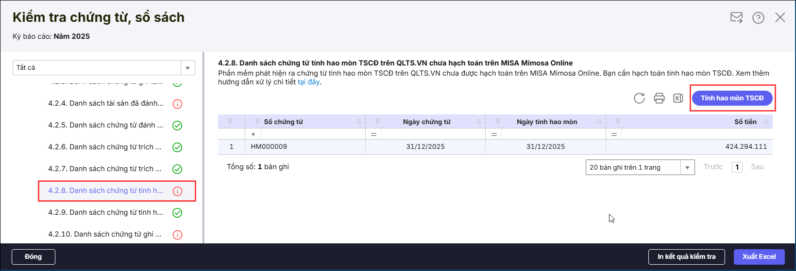 Trường hợp các tài sản cố định đã được tính hao mòn trên phần mềm QLTS nhưng quên chưa hạch toán trên Mimosa thì chương trình sẽ hiển thị báo cáo chi tiết tại phần 4.2.8 như sau: