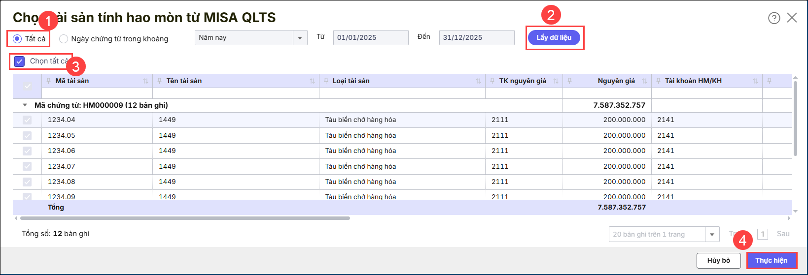1. Vào ô Tính hao mòn TSCĐ phần mềm sẽ chuyển sang giao diện lấy chứng từ hao mòn từ QLTS về Mimosa online.