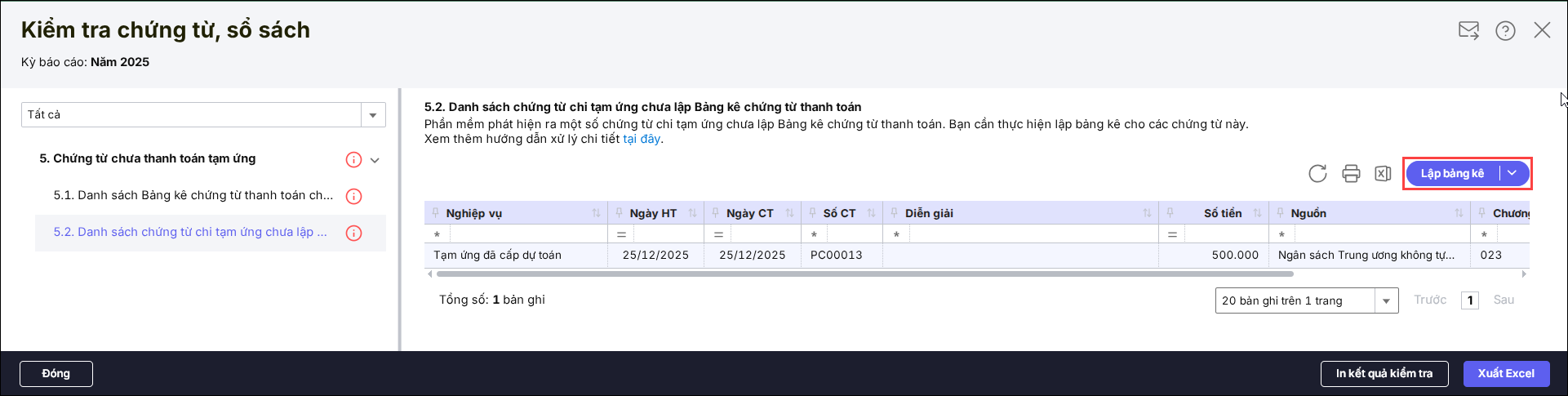 5.2. Danh sách chứng từ chi tạm ứng chưa lập bảng kê chứng từ thanh toán