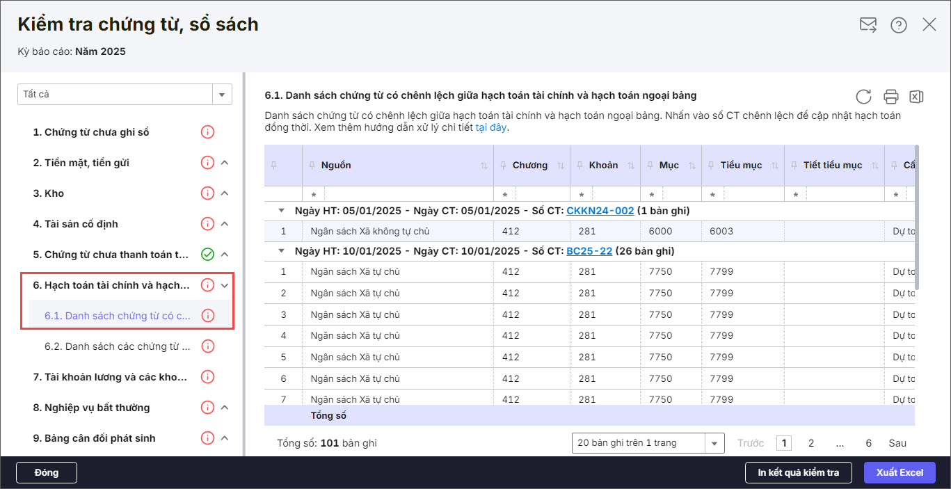Bài viết này hướng dẫn anh/chị cách kiểm tra và xử lý khi thực hiện kiểm tra chứng từ, sổ sách phần mềm cảnh báo danh sách chứng từ có chênh lệch giữa hạch toán tài chính và hạch toán ngoại bảng.