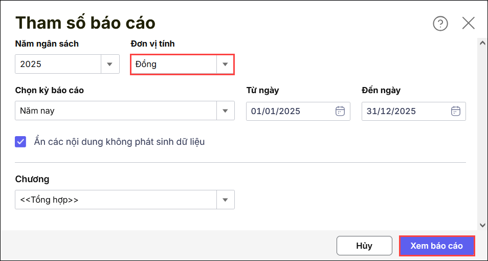 - Chọn đơn vị tính cần xem đến Đồng hoặc Triệu đồng (Nên chọn là Đồng để xem số liệu chi tiết nhất)