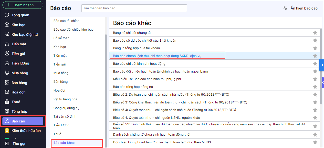 - Kích đúp chuột vào Báo cáo chênh lệch thu, chi theo hoạt động SXKD, dịch vụ.