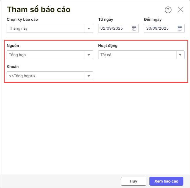 - Khai báo tham số in báo cáo, lưu ý chọn Nguồn, Khoản hoặc Hoạt động.