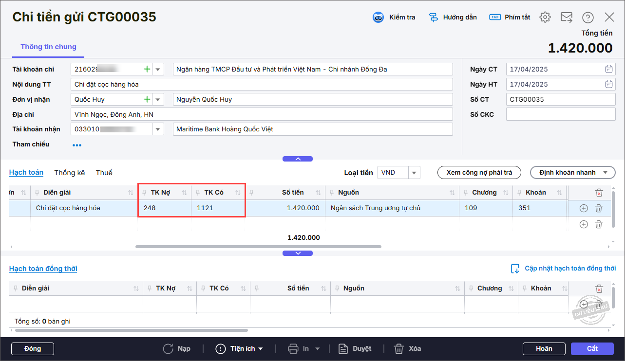 - Tài khoản chi: lựa chọn hoặc khai báo thêm tài khoản ngân hàng, kho bạc chi tiền.