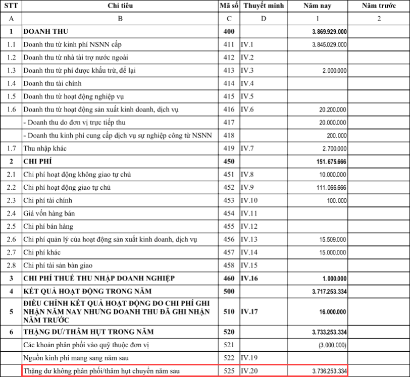 “Thặng dư không được phân phối của đơn vị phát sinh trong năm bao gồm: Giá trị còn lại của TSCĐ, kinh phí chi đầu tư đã thanh toán khối lượng hoàn thành trong năm chưa bàn giao đưa vào sử dụng và các khoản thặng dư không được phân phối khác (nếu có).