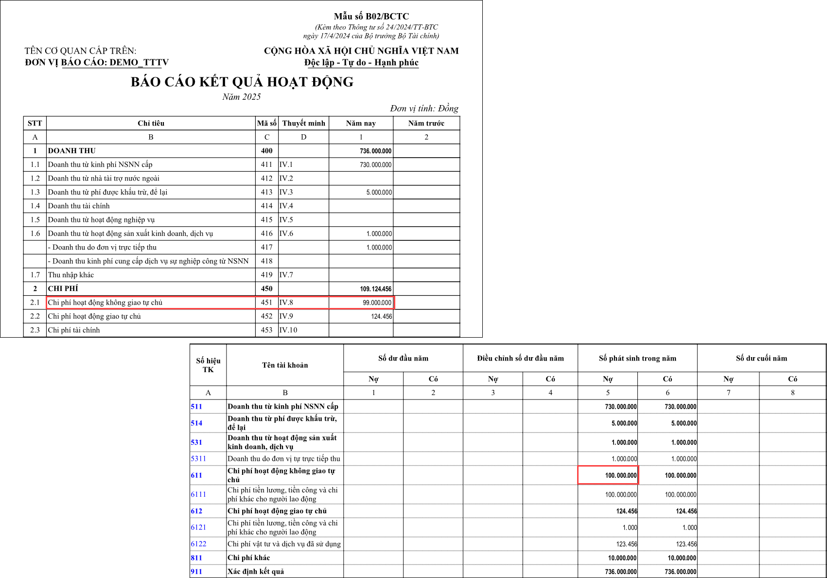 Bài viết này hướng dẫn anh/chị cách kiểm tra và xử lý khi xem báo cáo Báo cáo B02/BCTC – Báo cáo kết quả hoạt động thấy chỉ tiêu Chi phí hoạt động không giao tự chủ (mã số 451) không bằng tổng phát sinh Nợ TK 611 trên báo cáo S05-H – Bảng cân đối số phát sinh.