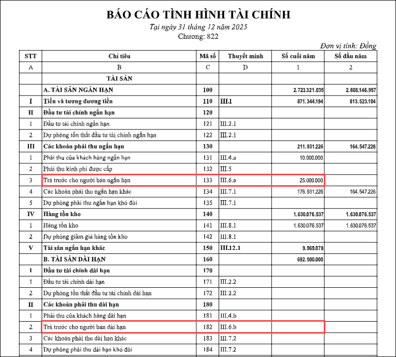 - Kiểm tra số dư Có TK 331 sẽ bằng với tổng 2 chỉ tiêu Trả trước cho người bán ngắn hạn (mã số 133) và chỉ tiêu Trả trước cho người bán dài hạn (mã số 182) trên báo cáo B01/BCTC: Báo cáo tình hình tài chính.
