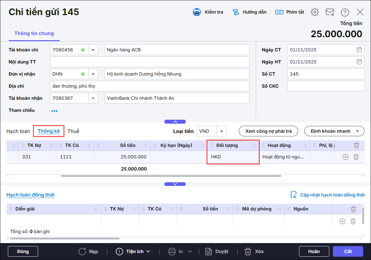 Ví dụ: Khi mua hàng đang chọn đối tượng: HKD, thì khi thanh toán cần phải chọn ở Tab 2.Thống kê cũng đối tượng: HKD. Như vậy, cần sửa lại chứng từ thanh toán trả tiền cho nhà cung cấp: