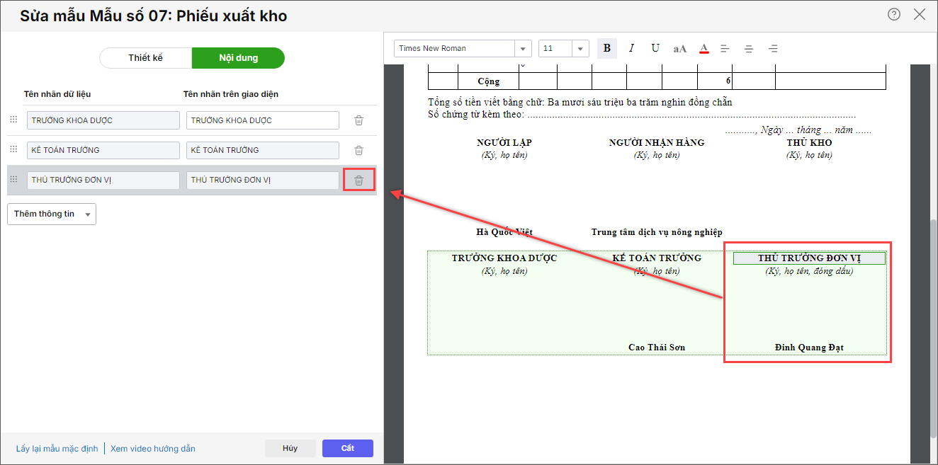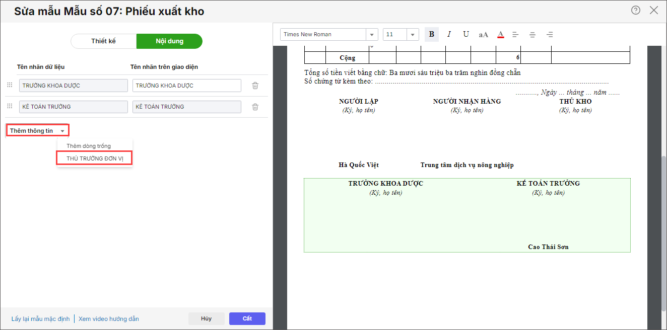 – Kể từ phiên bản R14: Khi sửa mẫu Mẫu số 07: Phiếu xuất kho, bạn có thể Xóa hoặc thêm lại thông tin Thủ trưởng đơn vị.