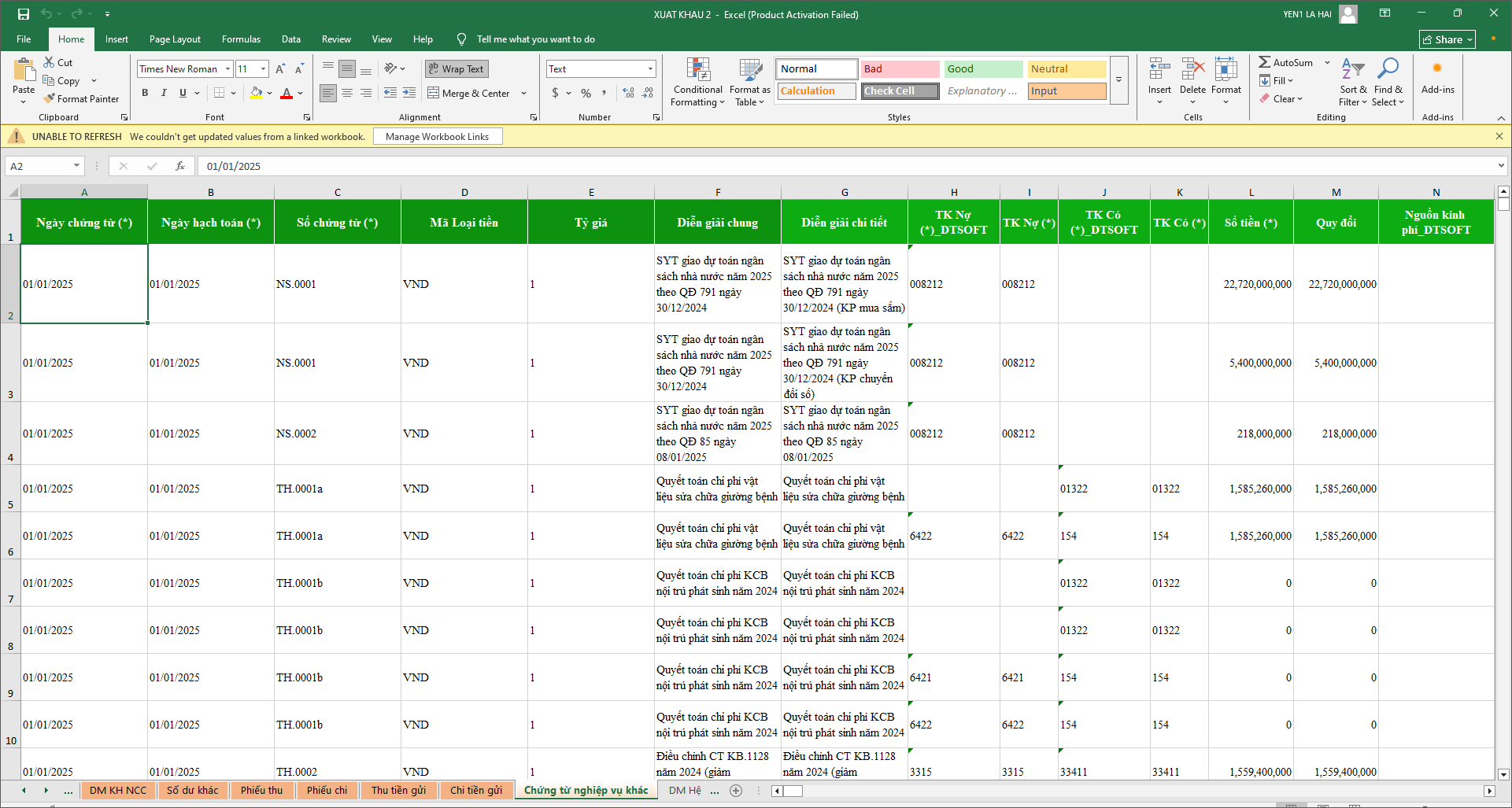 Bước 2: Thực hiện kiểm tra các sheet danh mục sau: Hệ thống tài khoản; Nguồn kinh phí; Loại khoản; Mục, tiểu mục; CTMT, dự án; Mã thống kê; Tài khoản NH, KB; Loại vật tư; Kho; Mục tiểu mục TT342.