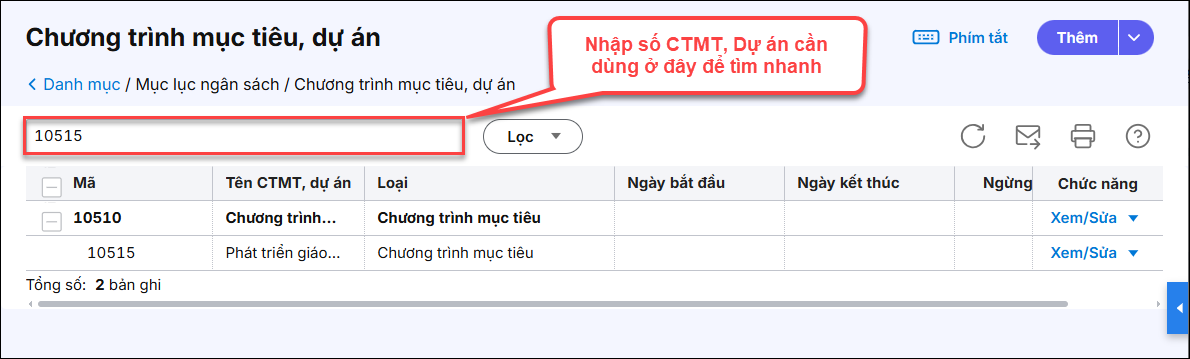 Lưu ý: Có thể điền mã CTMT, dự án ở ô Lọc để lọc tìm nhanh
