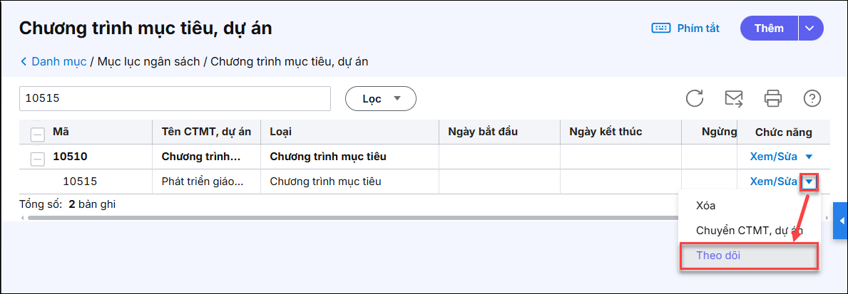 5. Nếu không tìm thấy mã CTMT, dự án cần sử dụng thì anh\chị thực hiện thêm mới CTMT, dự án: Chọn vào CTMT, dự án tổng hợp cần thêm, nhấn Thêm.
