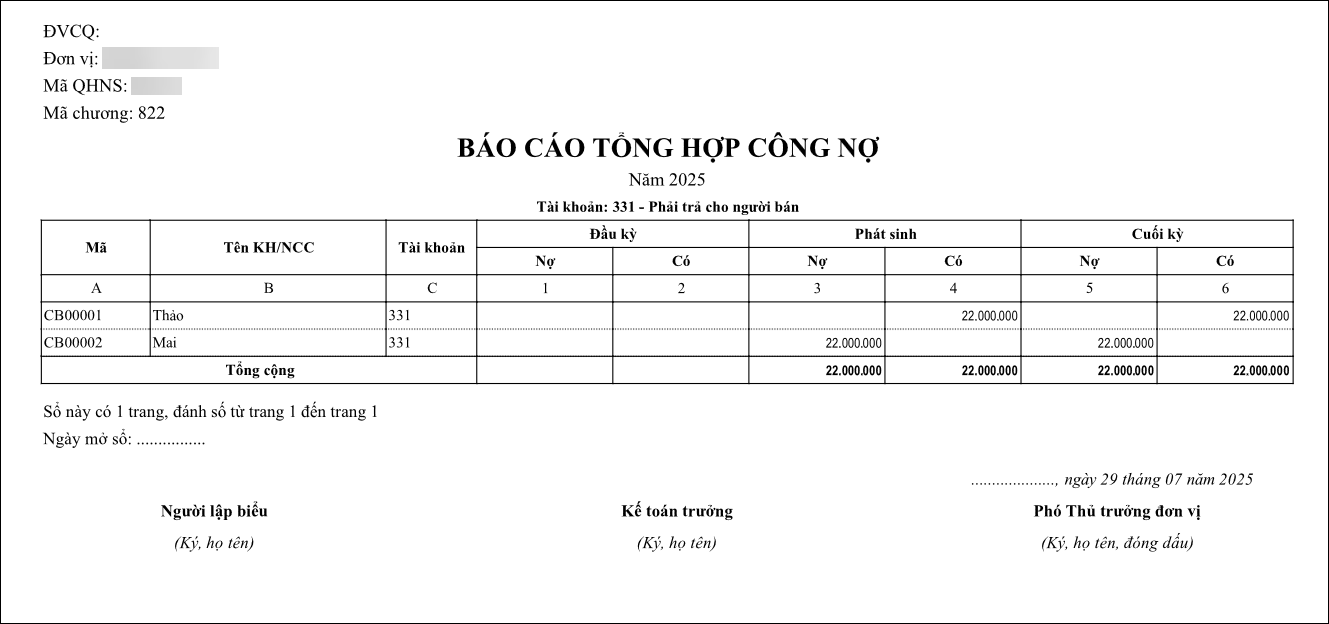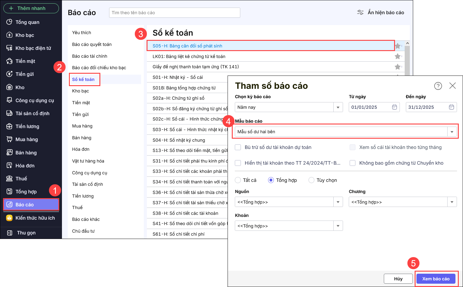 – Khi in S05-H: Bảng cân đối sẽ phát sinh, chọn Mẫu hiển thị số dư hai bên