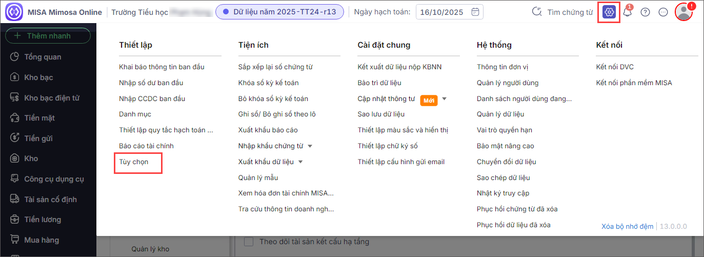 - Chọn mục cần hiển thị cột Hợp đồng trên chứng từ, ví dụ mục Hạch toán.