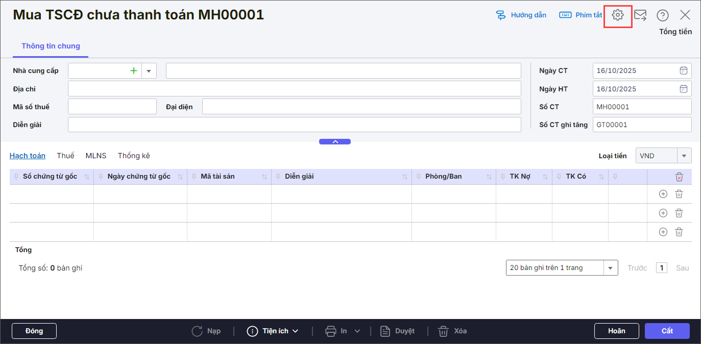 - Trên chứng từ Mua TSCĐ chưa thanh toán, nhấn Tùy chỉnh giao diện.