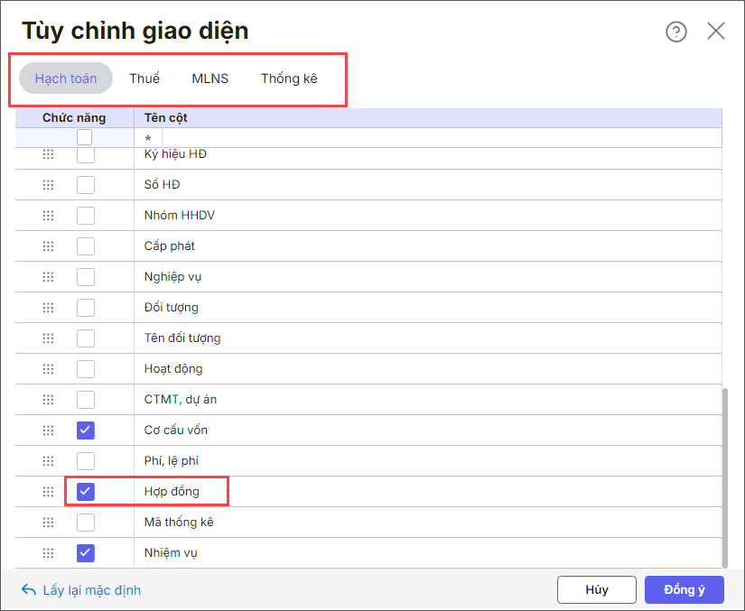- Tích chọn vào cột Hợp đồng để hiển thị cột này trên mục Hạch toán của chứng từ.
