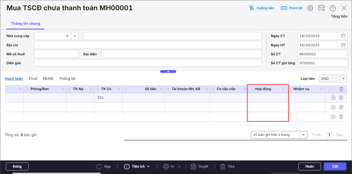 - Anh/chị có thể chọn thông tin Hợp đồng cho từng dòng hạch toán.