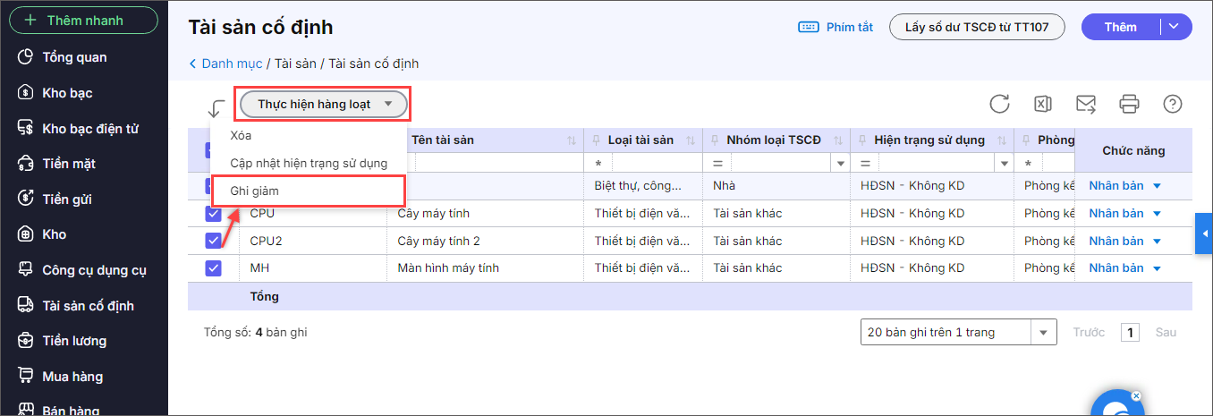 – Kể từ phiên bản R12: Tại danh mục Tài sản cố định, phần mềm bổ sung chức năng Thực hiện hàng loạt\Ghi giảm.