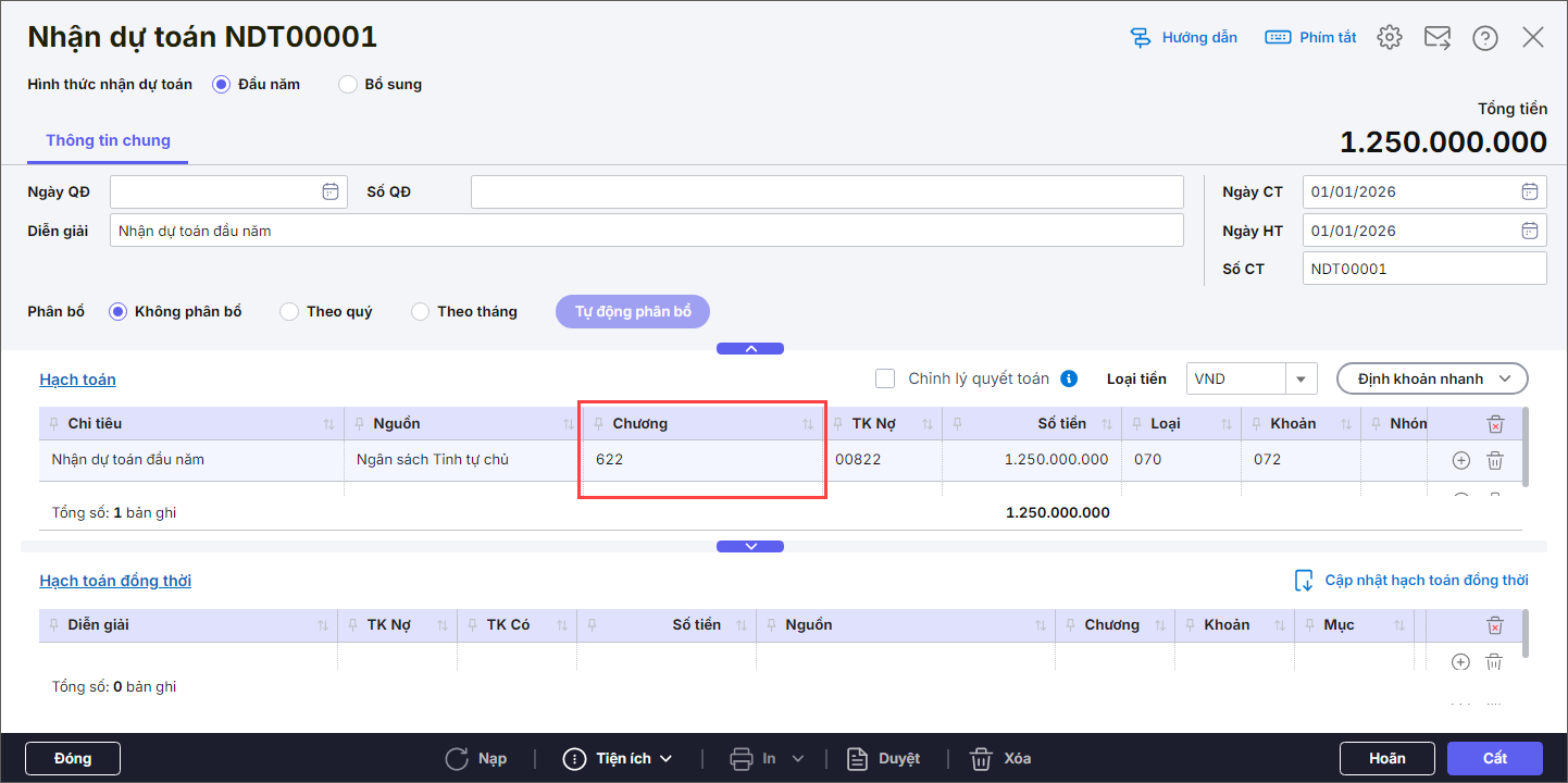Khi nhận được quyết định giao dự toán đầu năm/bổ sung cho nhiều chương, kế toán có thể ghi nhận số dự toán cho nhiều chương trên cùng 1 chứng từ để làm việc nhanh hơn.