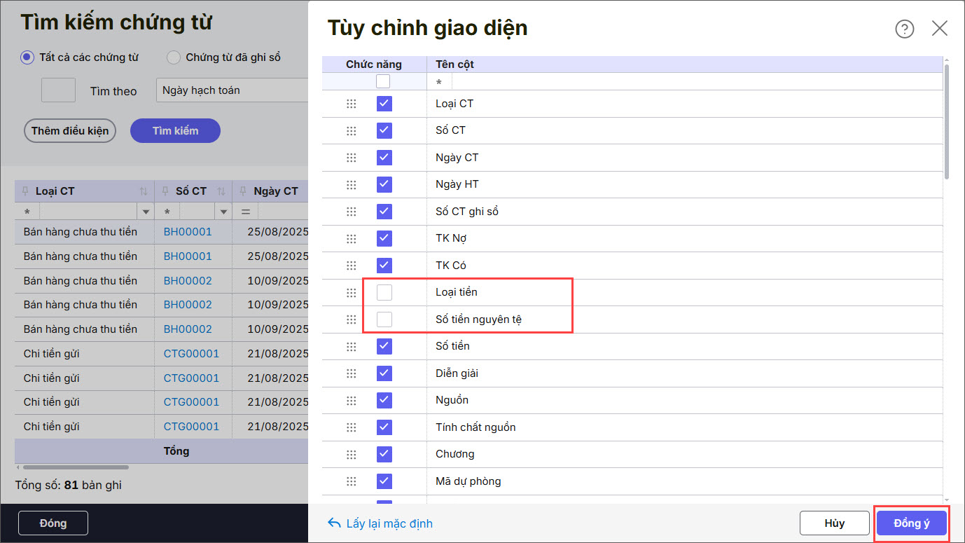 Bước 2: Bỏ tích tại ô Loại tiền Số tiền nguyên tệ. Nhấn Đồng ý.