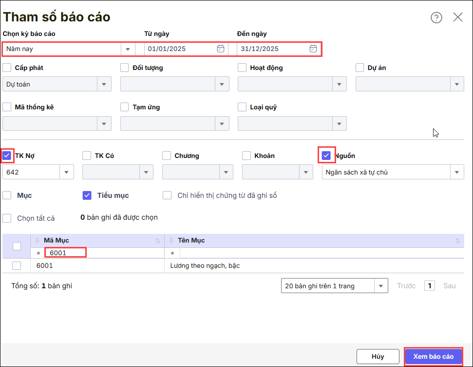 Tùy chọn tham số Mục hoặc Tiểu mục khi in Báo cáo thống kê chứng từ kế toán