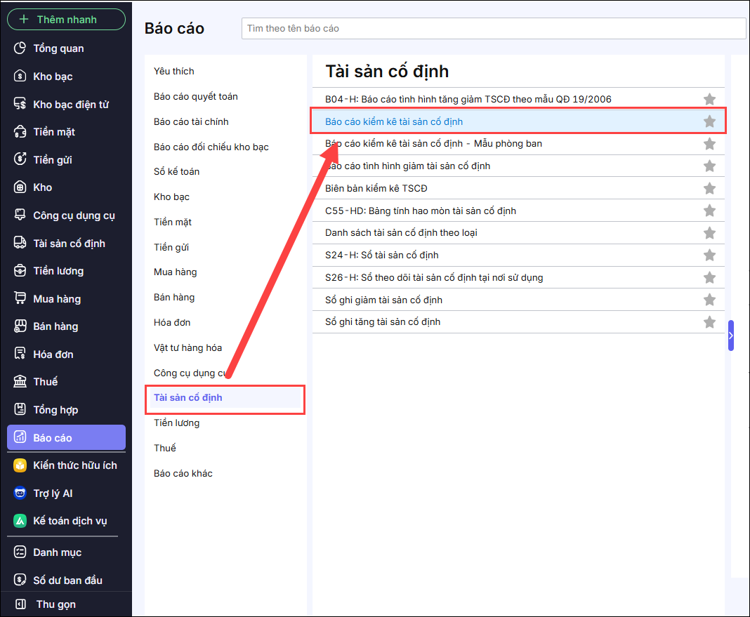 Bước 1: Vào Menu Báo cáo\Tài sản cố định, chọn Báo cáo kiểm kê tài sản cố định hoặc Biên bản kiểm kê TSCĐ