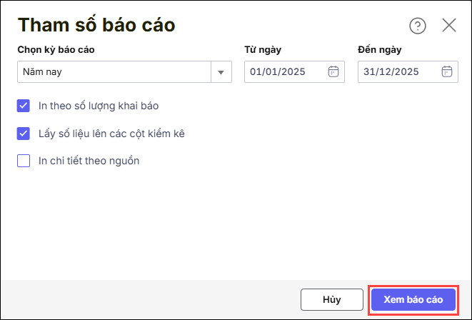 Bước 2: Khai báo các tham số trên báo cáo Báo cáo kiểm kê tài sản cố định hoặc Biên bản kiểm kê TSCĐ