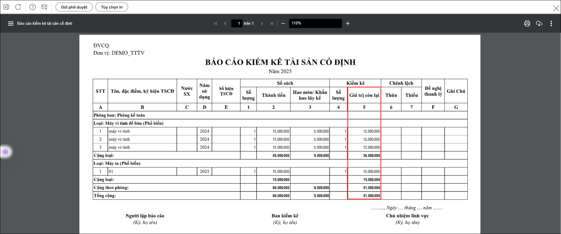 - Để xem Giá trị còn lại của chi tiết Tài sản cố định, anh chị có thể sử dụng mẫu Báo cáo kiểm kê TSCĐ hoặc Biên bản kiểm kê TSCĐ