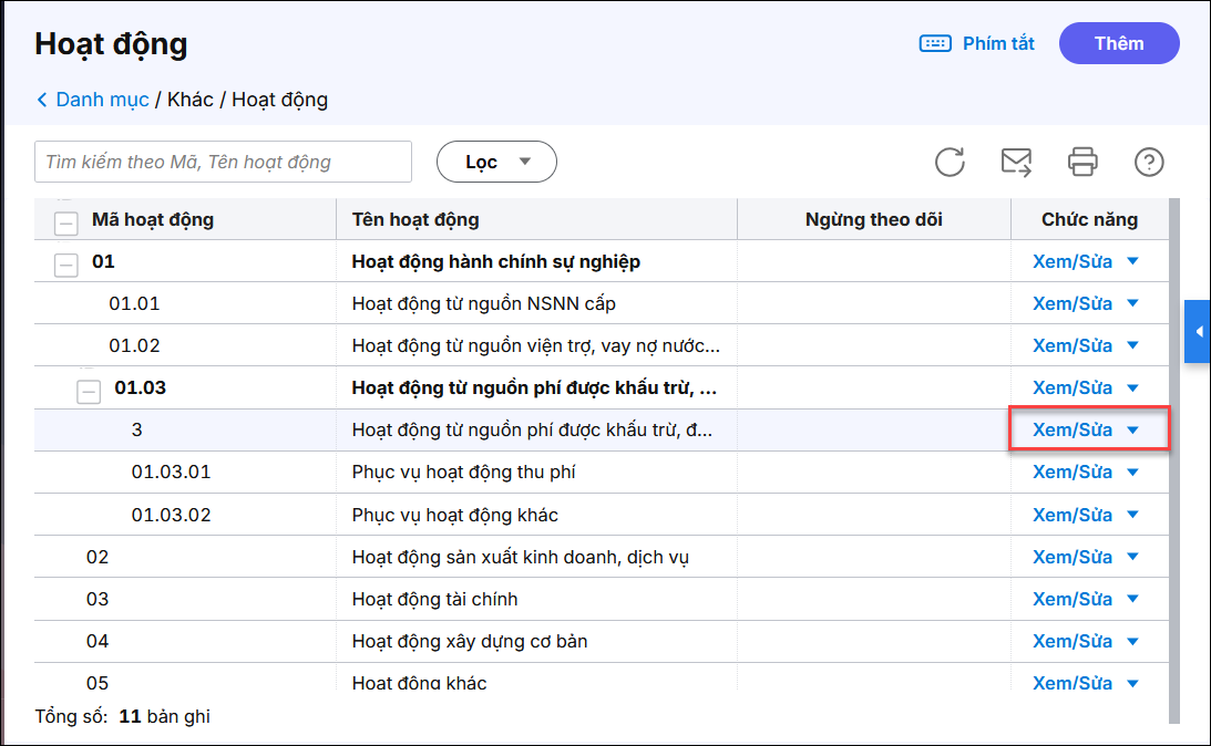 Bước 2: Tại dòng hoạt động cần sửa, nhấn vào biểu tượng⏷ở cột Chức năng rồi nhấn Xem/sửa