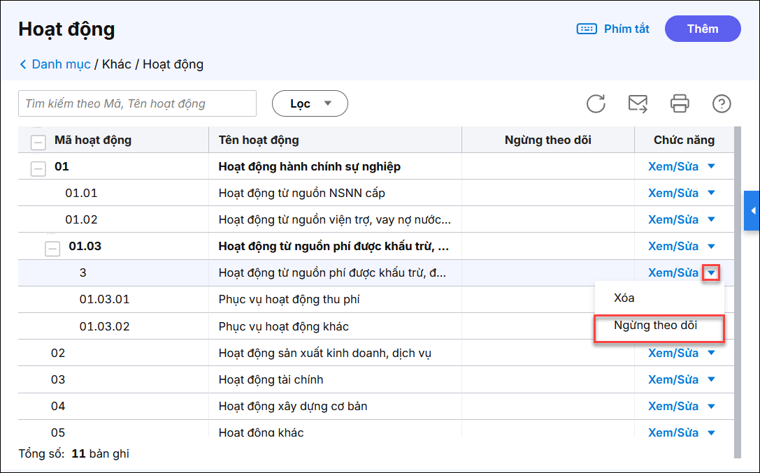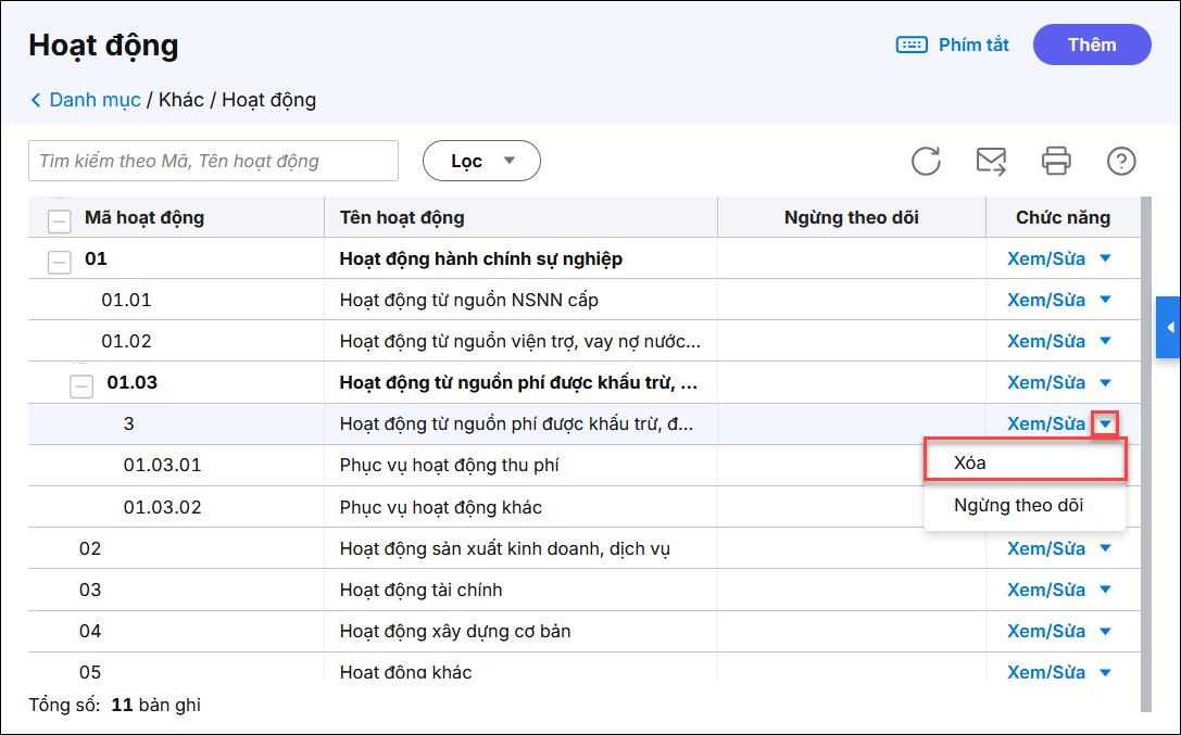 Lưu ý: Nếu hoạt động đã có phát sinh sẽ không xóa được, bạn cần sửa toàn bộ phát sinh sang hoạt động đúng rồi mới thực hiện xóa, hoặc thực hiện ngừng theo dõi theo hướng dẫn tại đây để không hiển thị hoạt động này trên chứng từ, tránh chọn nhầm.
