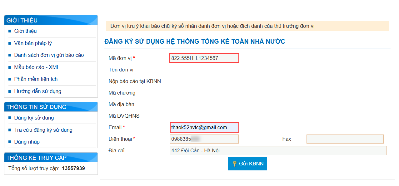 • Email: Điền email của Kế toán trưởng hoặc thủ trưởng đơn vị để hệ thống gửi lại tên và mật khẩu đăng nhập