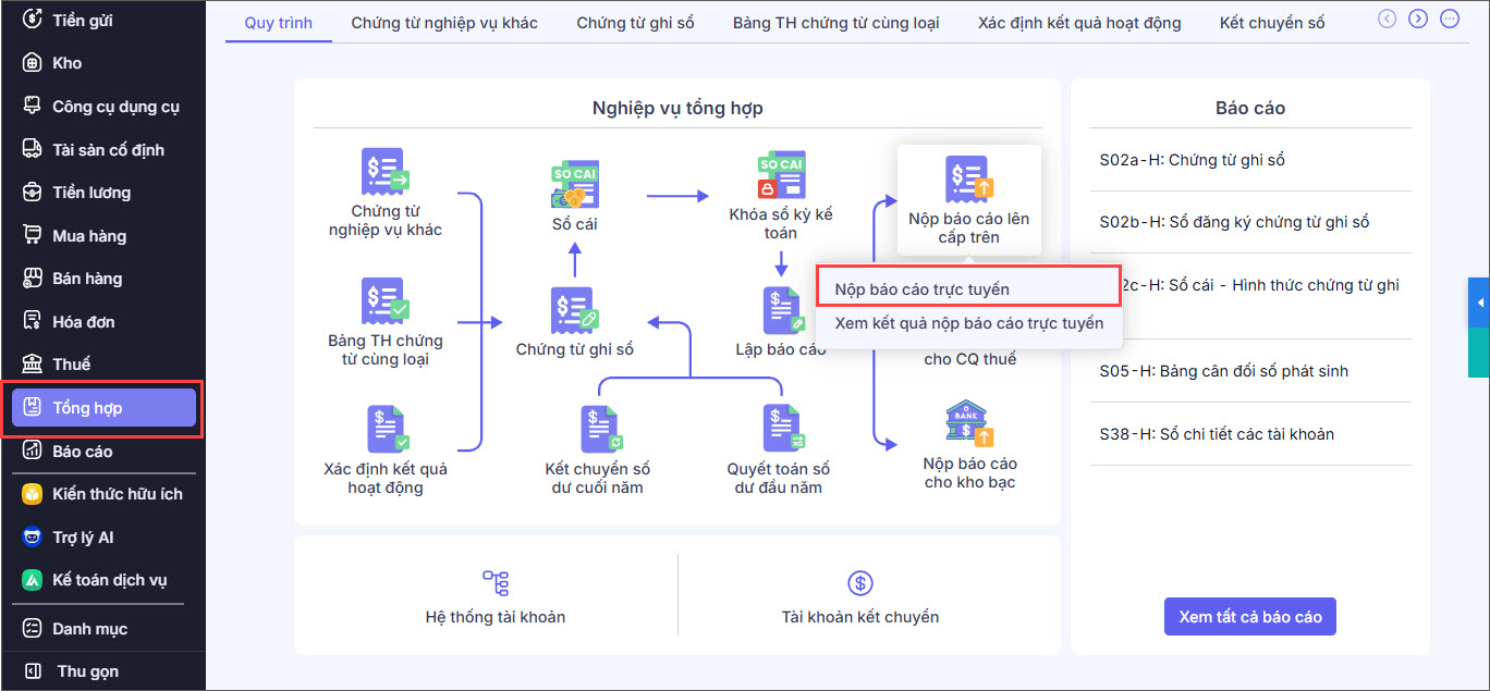 Bước 1: Vào phân hệ Tổng hợp, chọn Nộp báo cáo lên cấp trên\Nộp báo cáo trực tuyến.