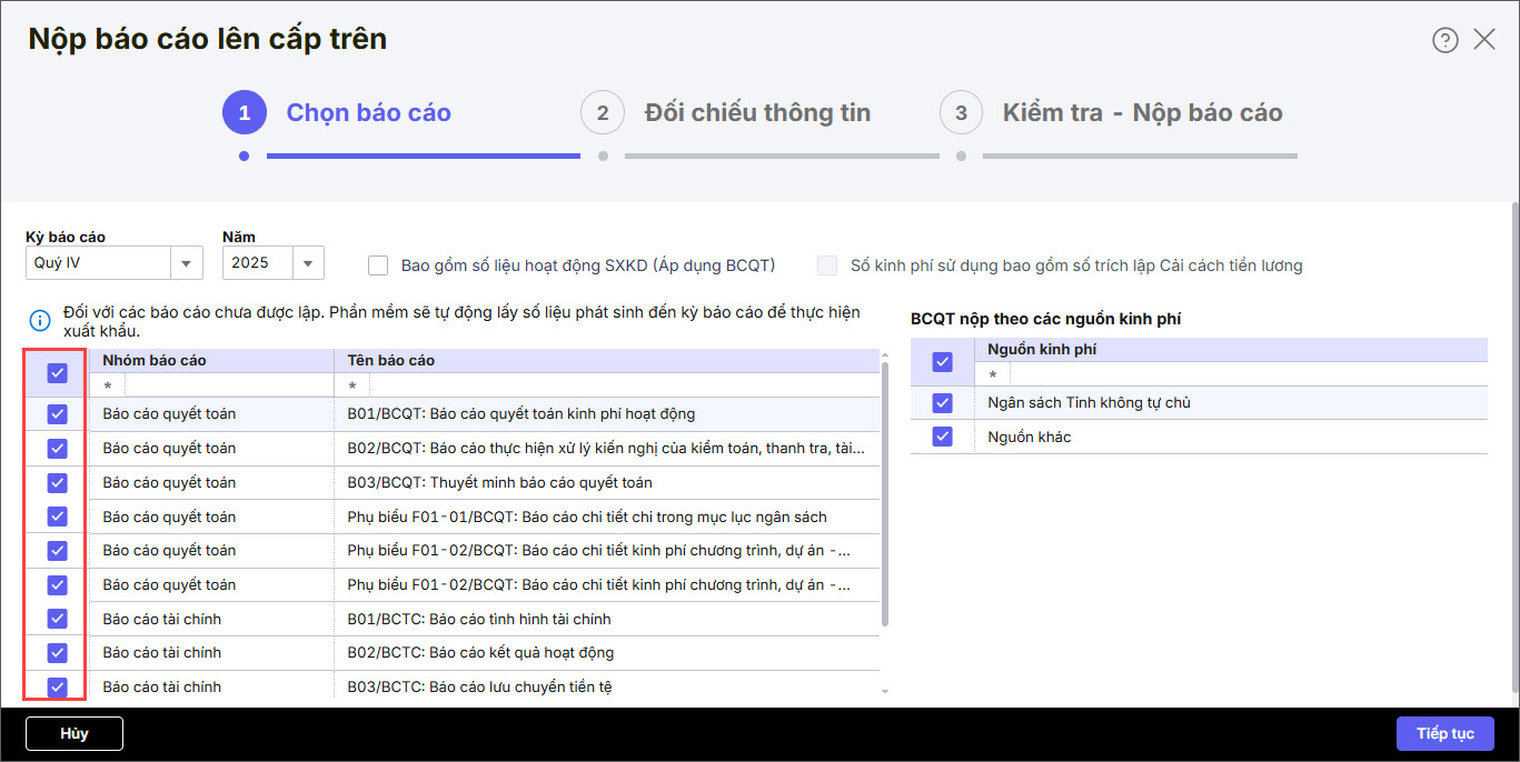 - Tại phần BCQT nộp theo các nguồn kinh phí, anh/chị tích chọn Nguồn kinh phí nào thì số liệu BCQT nộp lên cấp trên sẽ lấy theo các nguồn tương ứng.