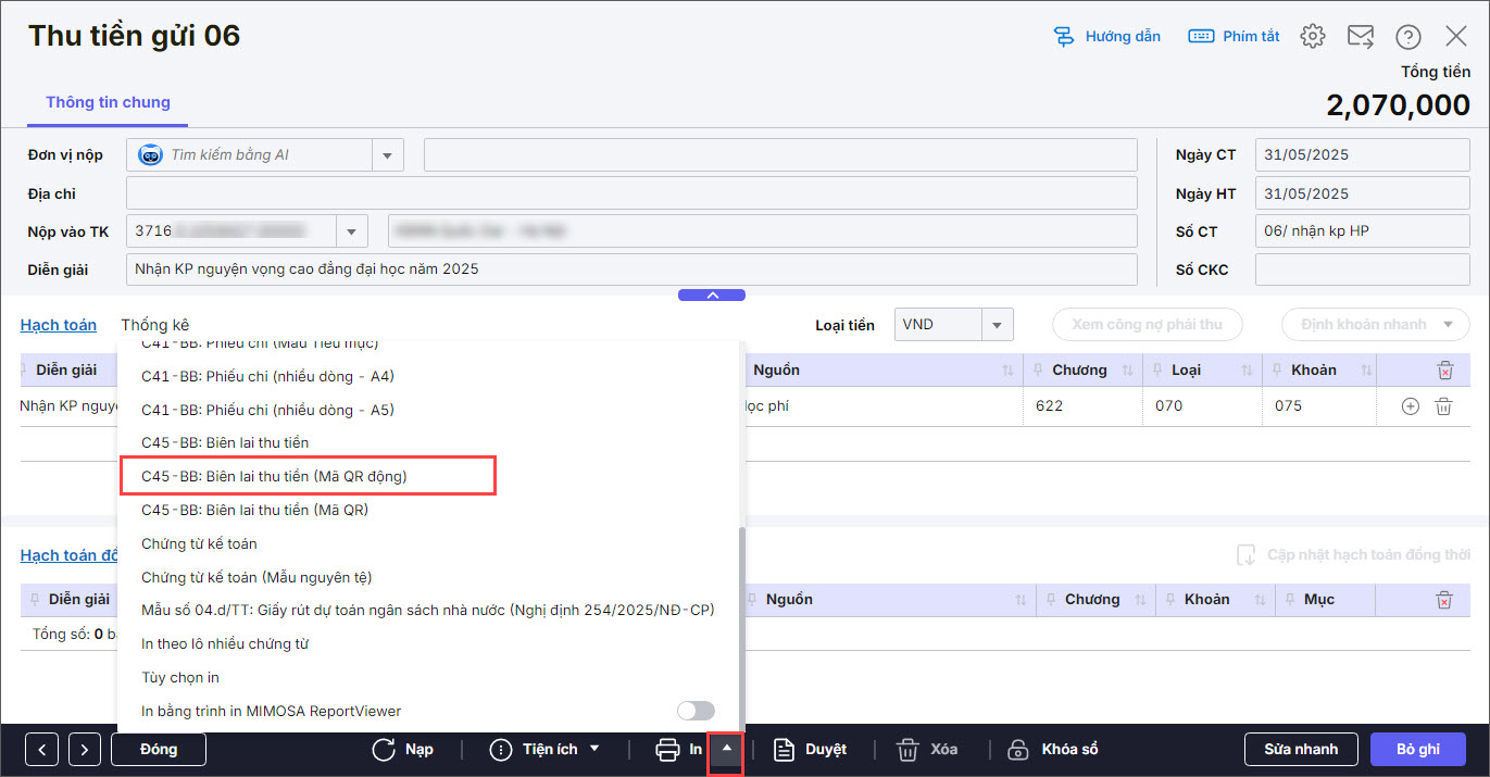 Bước 1: Trên chứng từ Thu tiền gửi, nhấn In và chọn Biên lai thu tiền (Mã QR động).