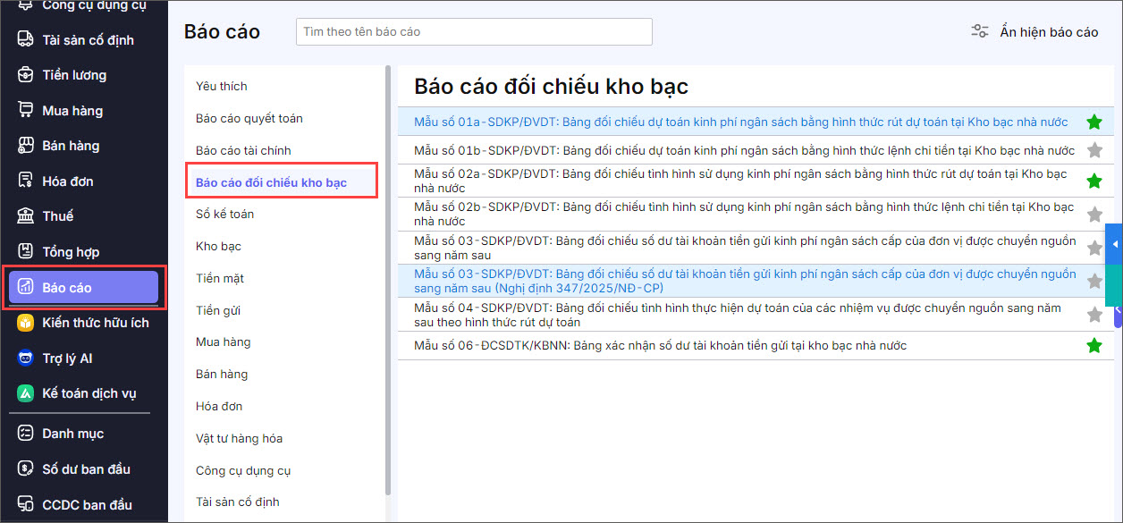 Bước 1: Vào mục Báo cáo\Báo cáo đối chiếu kho bạc.