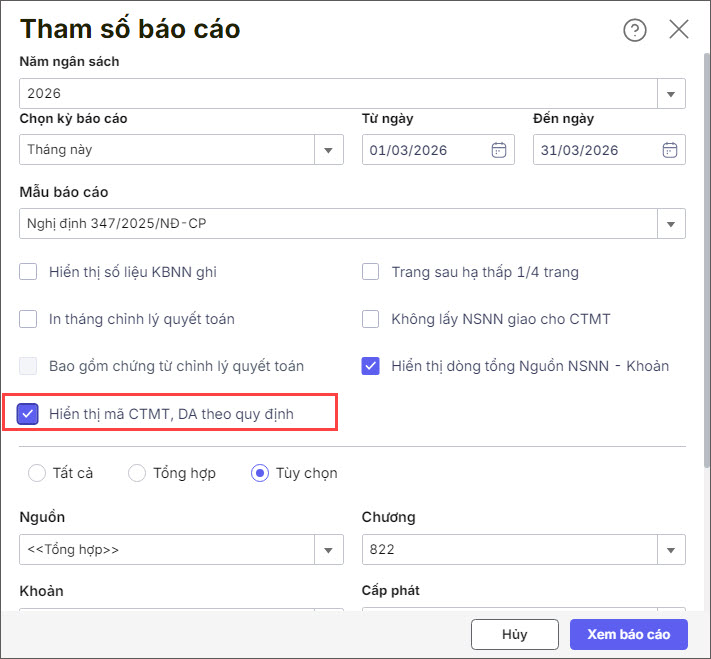 Bước 3: Khai báo tham số in báo cáo, lưu ý tích chọn “Hiển thị mã CTMT, DA theo quy định”.