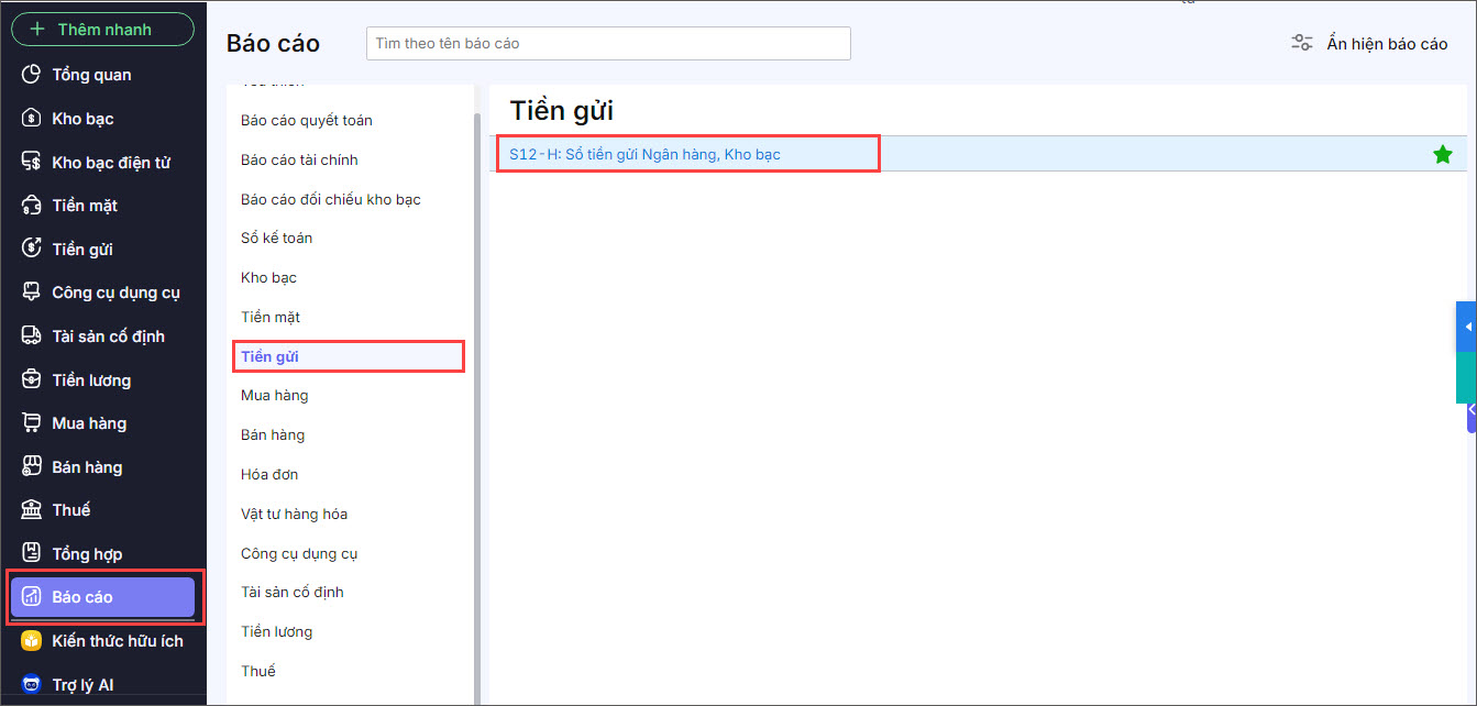 Bước 1: Vào mục Báo cáo\Tiền gửi.