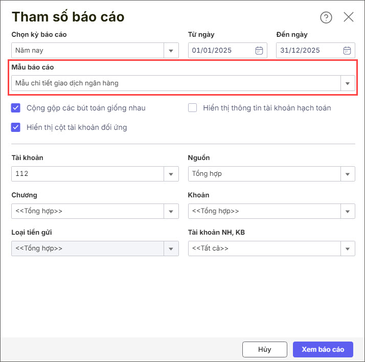 Bước 3: Khai báo tham số in, lưu ý chọn Mẫu báo cáo là Mẫu chi tiết giao dịch ngân hàng.