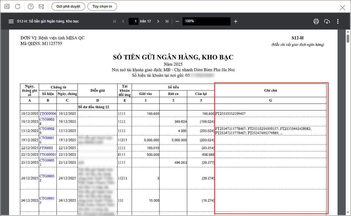 4. In S12-H: Sổ tiền gửi ngân hàng, kho bạc hiển thị số giao dịch ngân hàng liên kết với chứng từ kế toán