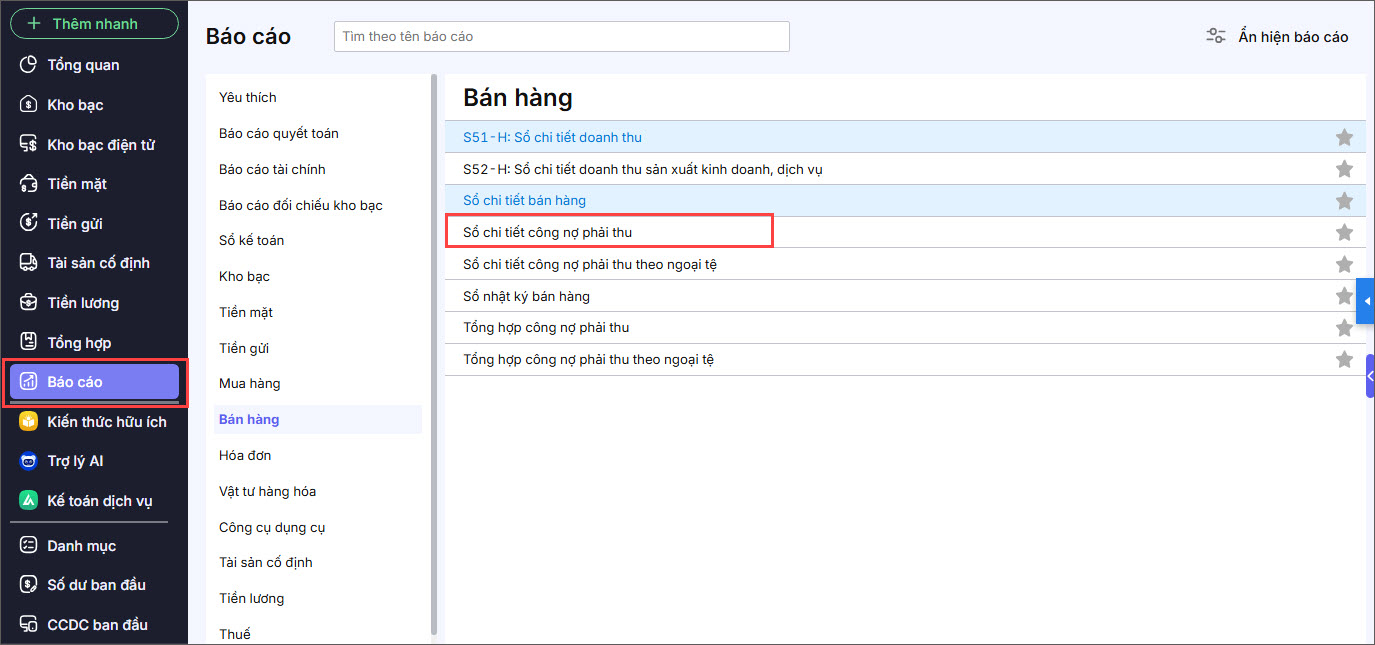 Bước 2: Chọn in Sổ chi tiết công nợ phải thu hoặc Sổ chi tiết công nợ phải trả.