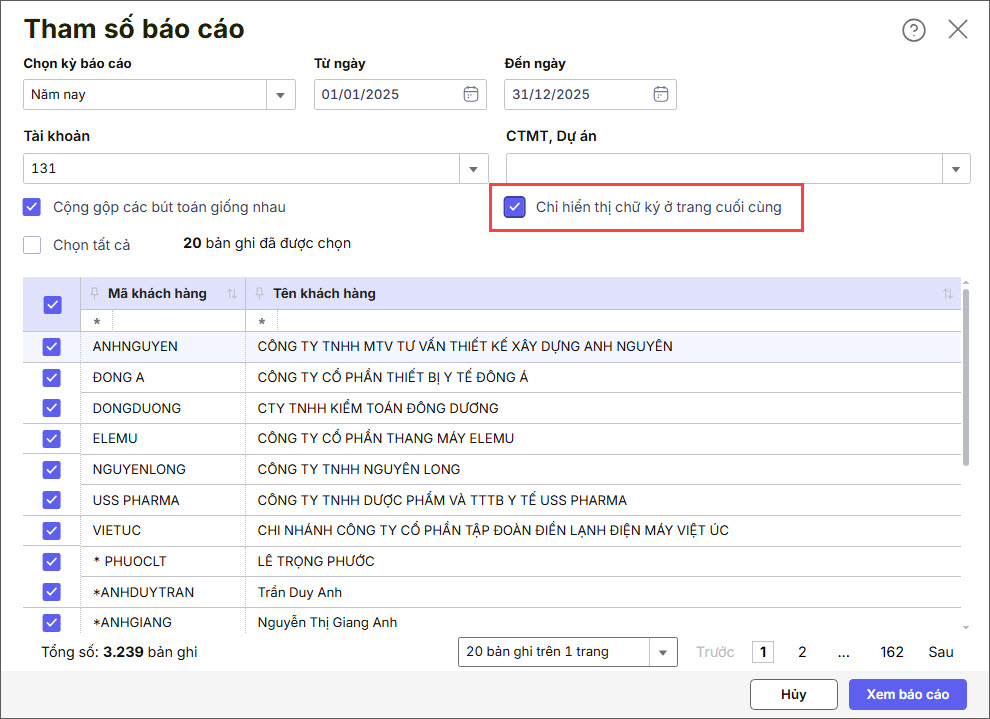 Bước 3: Khi khai báo tham số báo cáo, lưu ý tích chọn Chỉ hiển thị chữ ký ở trang cuối cùng.
