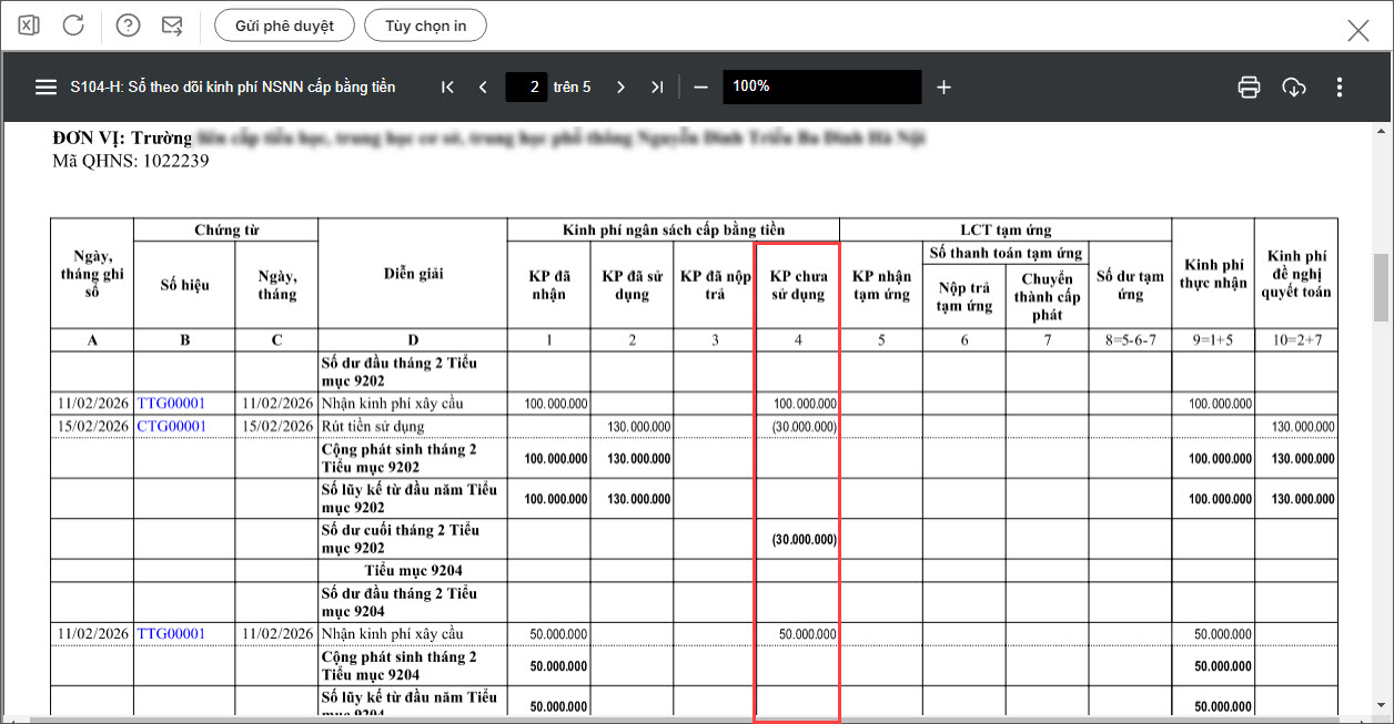 Khi in sổ S104-H: Sổ theo dõi kinh phí NSNN cấp bằng tiền, bạn có thể theo dõi được số dư từng thời điểm tại cột 4. Kinh phí chưa sử dụng để nhanh chóng biết được mục nào đang còn dư tiền.