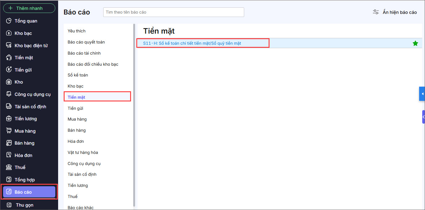 Bước 1: Vào mục Báo cáo\Tiền mặt.