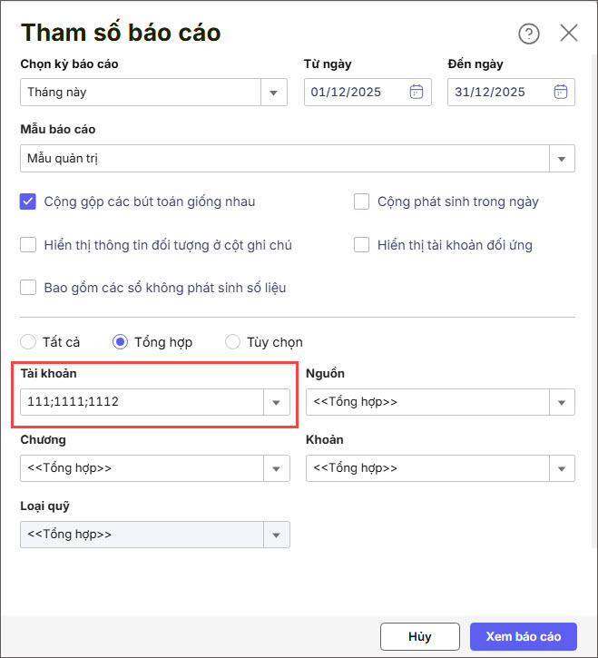 Bước 3: Khai báo tham số in, tại tham số Tài khoản, bạn có thể tích chọn 1 hoặc nhiều tài khoản cùng lúc.