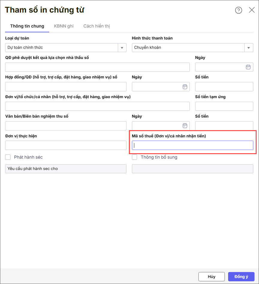 – Kể từ phiên bản R18: Bạn có thể nhập hoặc sửa trực tiếp thông tin Mã số thuế khi chọn tham số in các mẫu chứng từ C2-02a/NS và C4-02a/KB (NĐ347/2025/NĐ-CP).