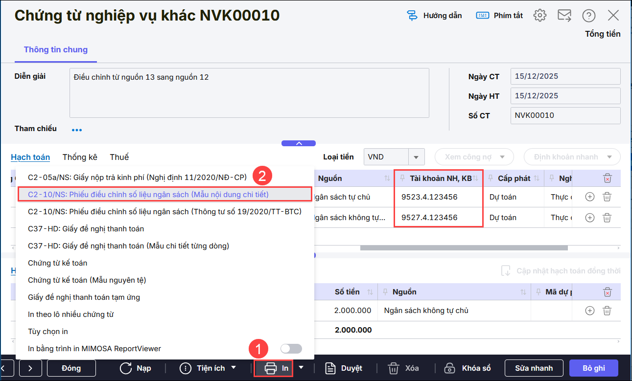 Bước 3 : Nhấn In\C2-10/NS: Phiếu điều chỉnh số liệu ngân sách (Mẫu nội dung chi tiết).