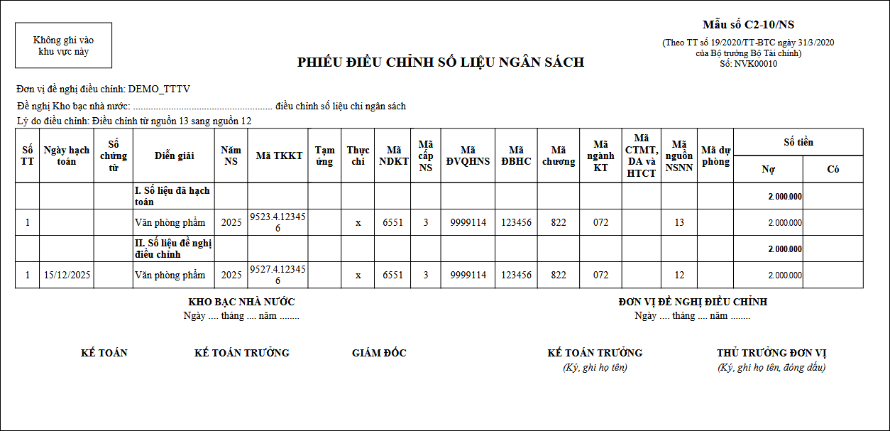 Bài viết hướng dẫn in mẫu C2-10/NS: Phiếu điều chỉnh ngân sách (Mẫu nội dung chi tiết) thể hiện diễn giải chi tiết theo nội dung diễn giải đã khai báo trên chứng từ, Mã TKKT, Mã ĐBHC đảm bảo chứng từ gửi Kho bạc đúng biểu mẫu, đúng quy định và dễ đối chiếu.