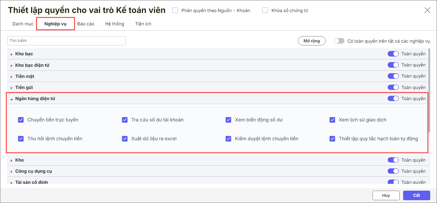 Chức năng này giúp Quản trị dữ liệu có thể quản lý và phân quyền sử dụng các nghiệp vụ Ngân hàng điện tử cho các kế toán khác nhằm đảm bảo an toàn, bảo mật.